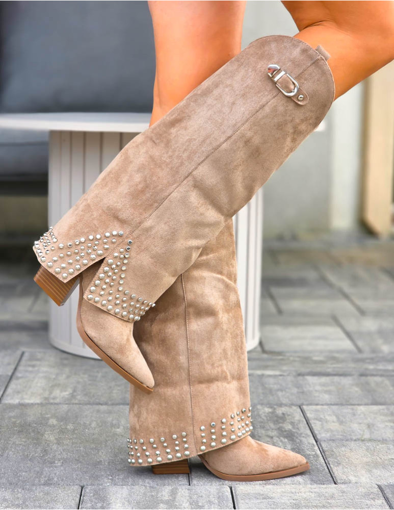 Beżowe Kozaki Na Słupku z Wywiniętą Cholewką SheSay
