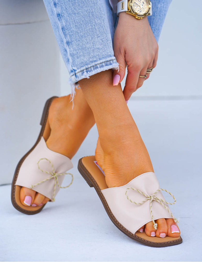 Beżowe Lekkie Klapki Skórzane Marszczone z Kokardką