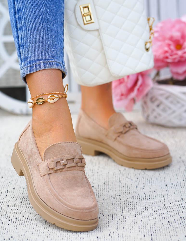 ❤Beżowe eleganckie zamszowe mokasyny z subtelnym łańcuszkiem