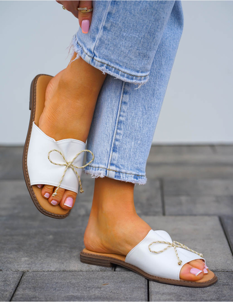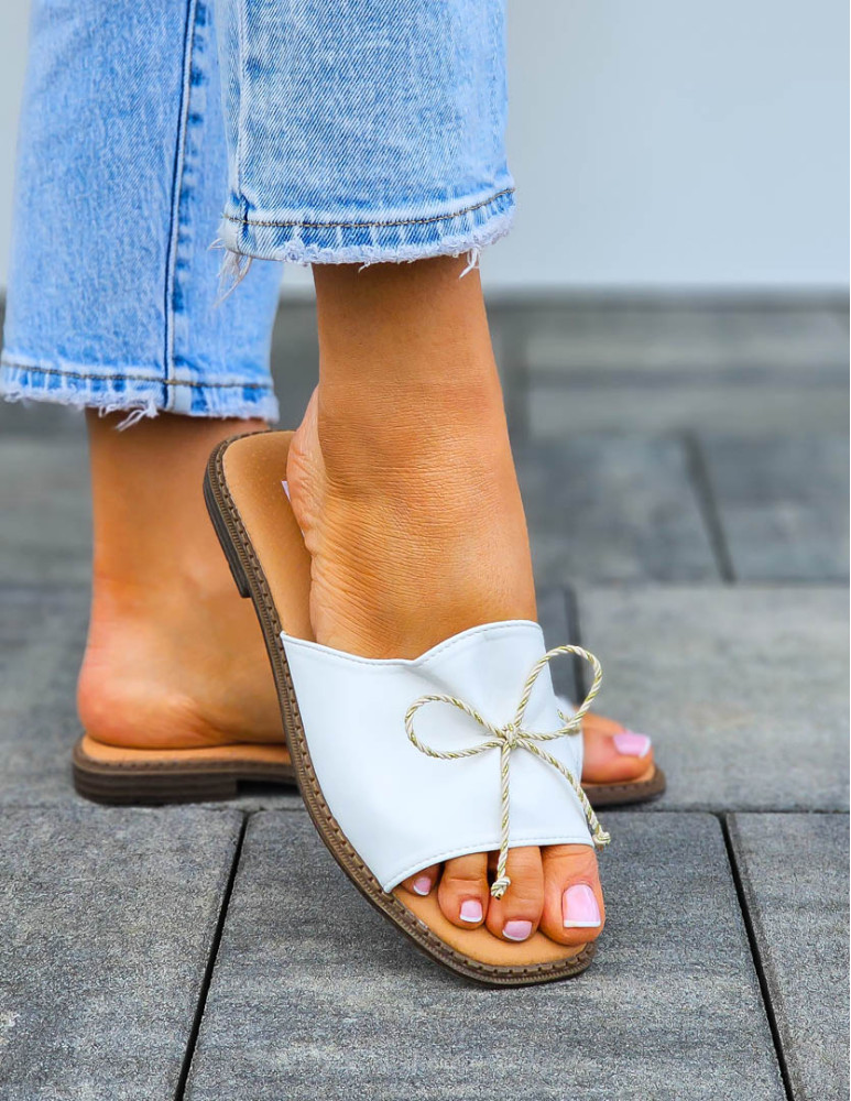 Białe Lekkie Klapki Skórzane Marszczone z Kokardką