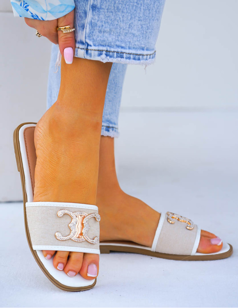 Eleganckie Białe Klapki Damskie Ze Złotą Klamerką Palms