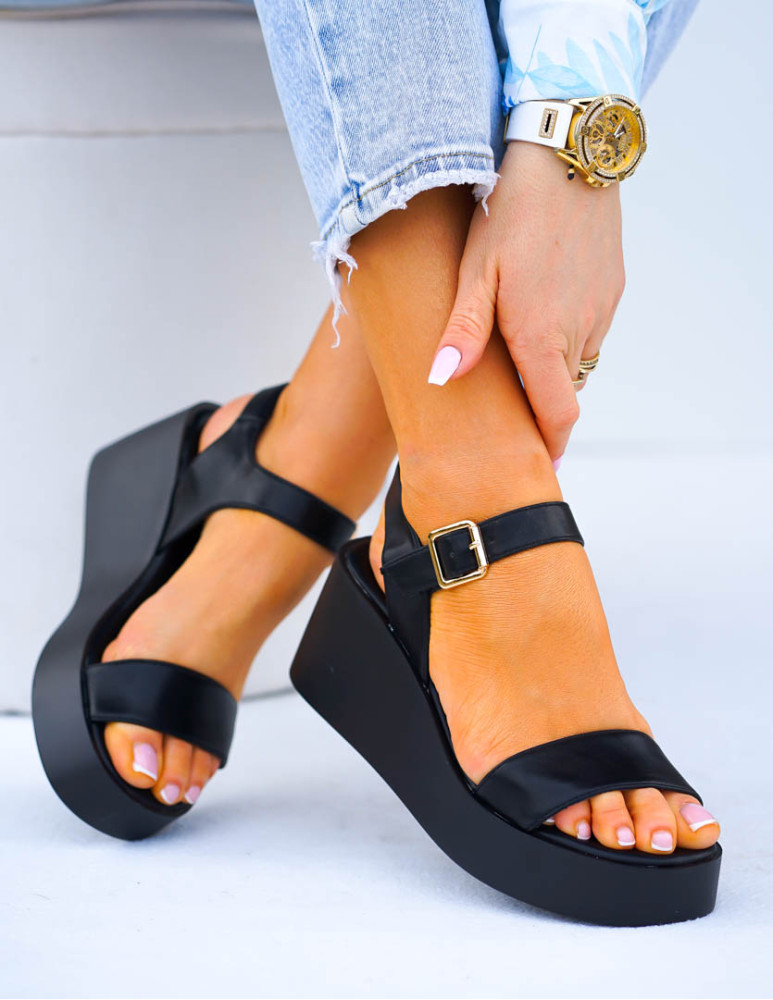 Czarne Sandały Na Niskiej Koturnie Na Gumki Gold