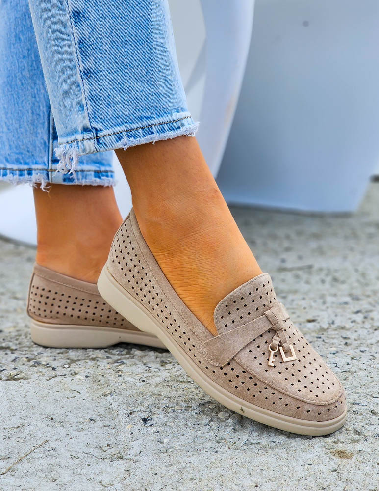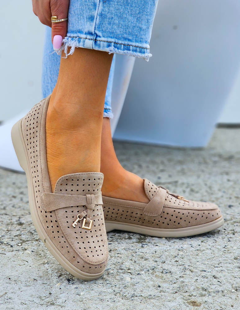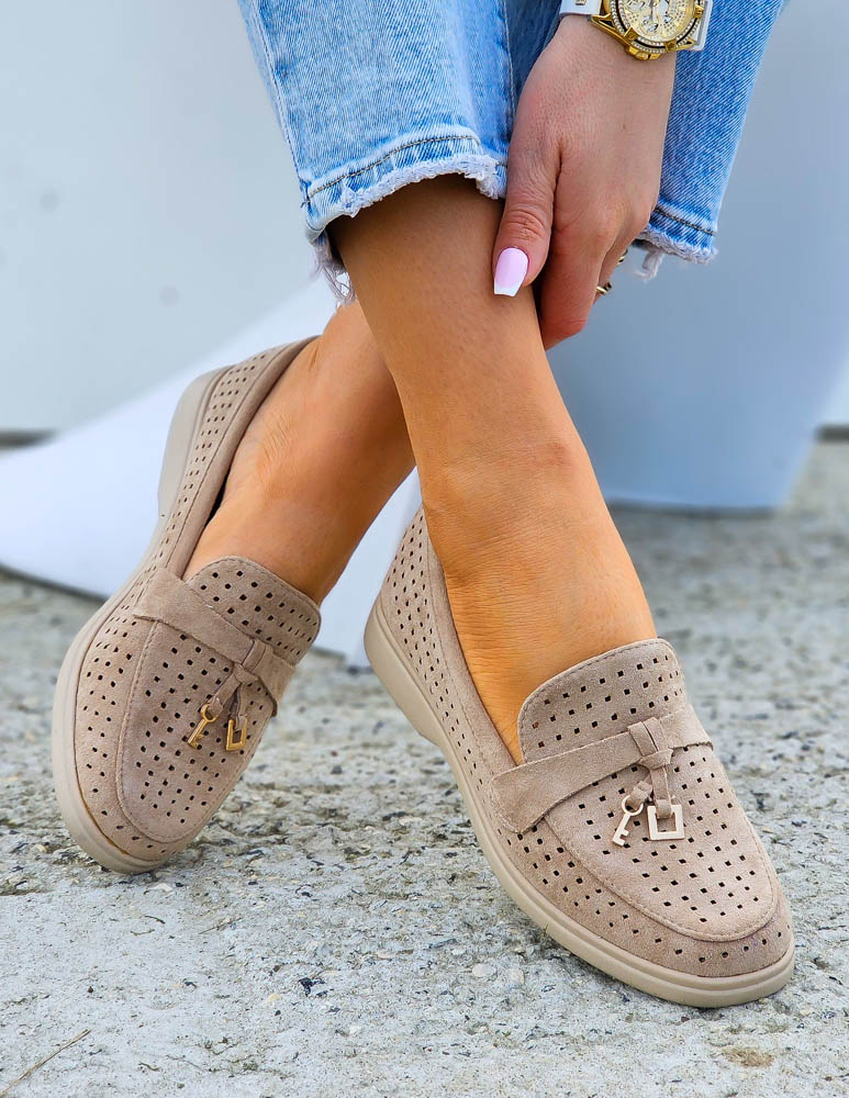 Eleganckie, beżowe, zamszowe mokasyny na lekkim podwyższeniu w ażurowy print