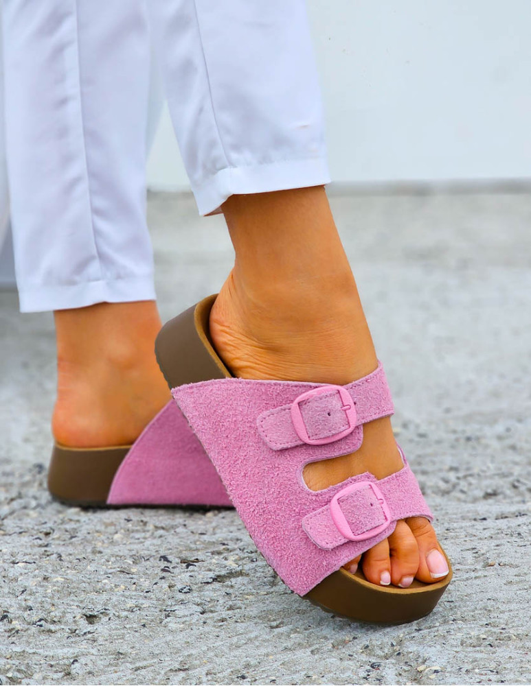 Bardzo wygodne klapki, na grubej korkowej podeszwie.W całości wykonane z mięciutkiej eco skóry zamsz..