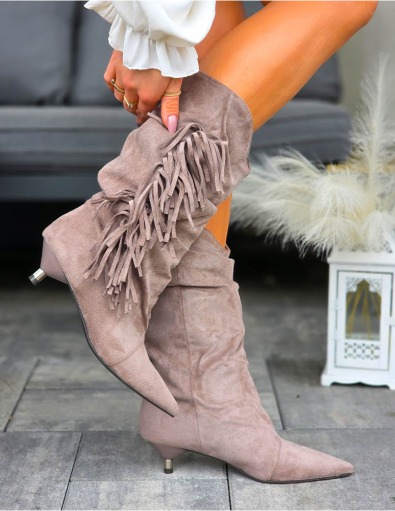 Kozaki Na Niskiej Szpilce z Marszczoną Cholewką i Frędzlami