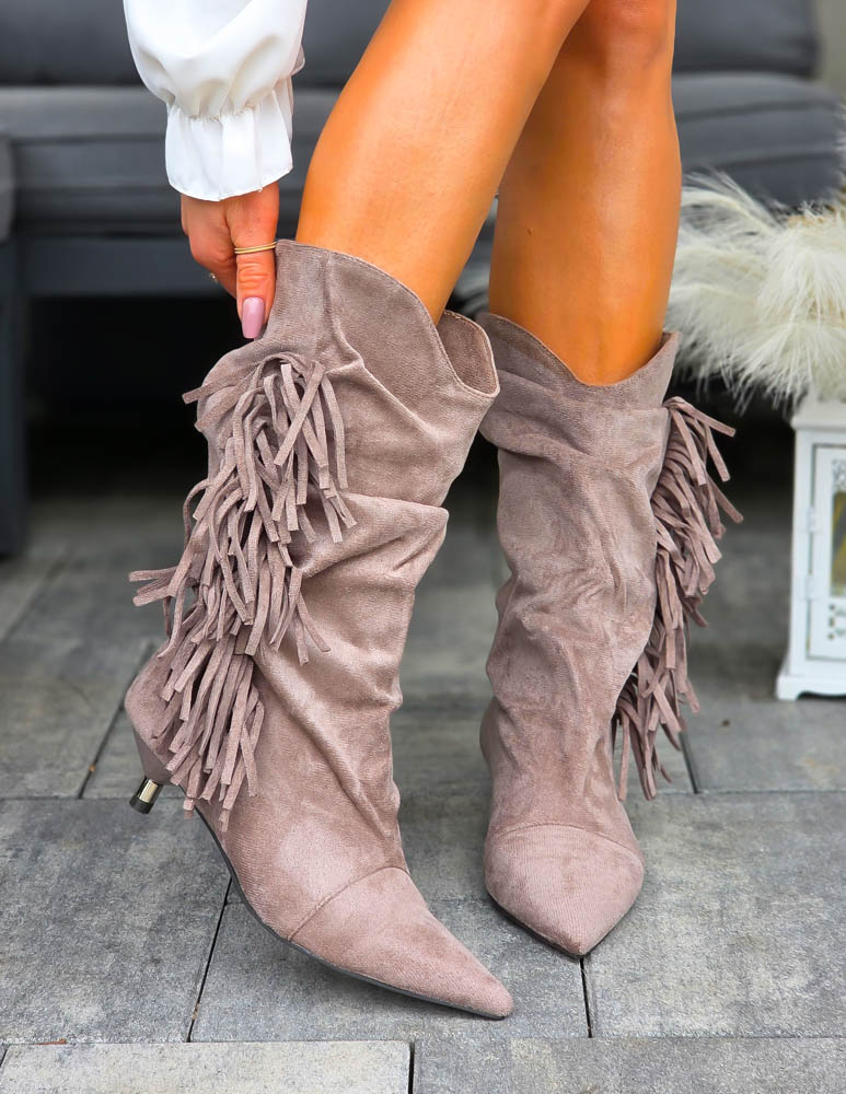 Beżowe Zamszowe Botki Kowbojki Damskie Loren