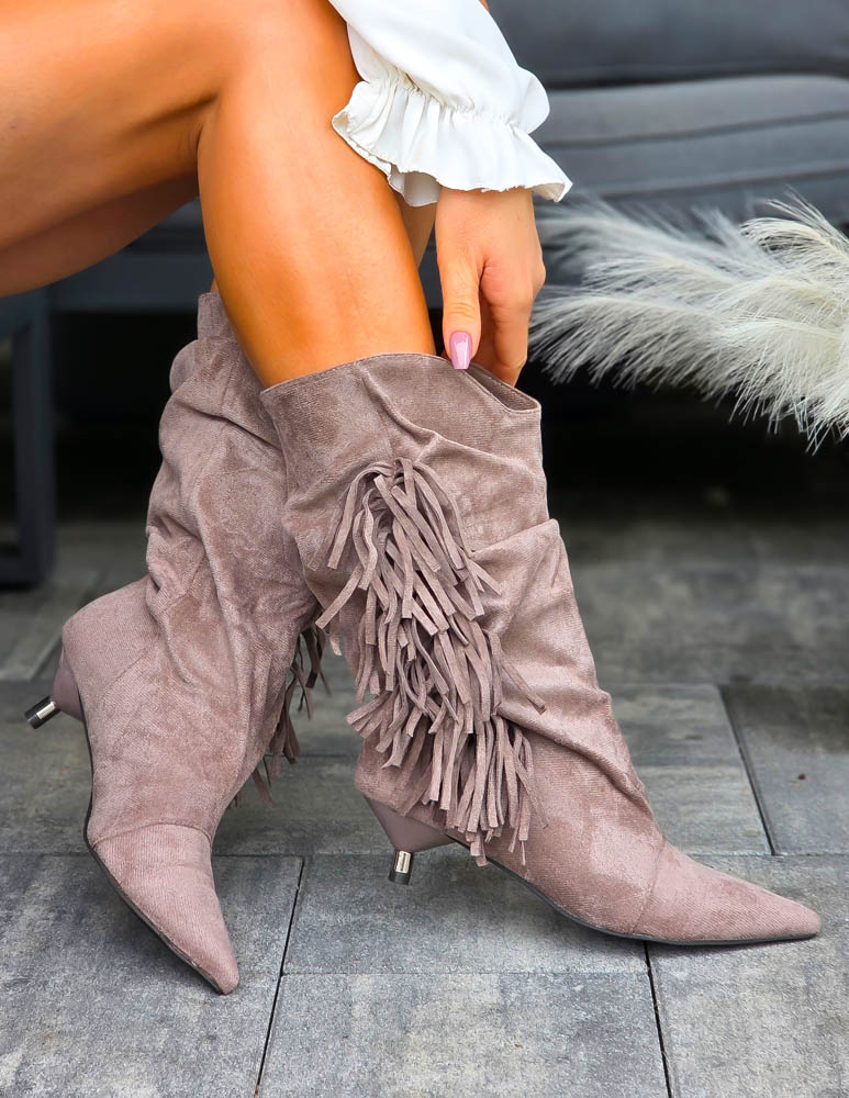 - Kod produktu: Kozaki Na Niskiej Szpilce z Marszczoną Cholewką i Frędzlami