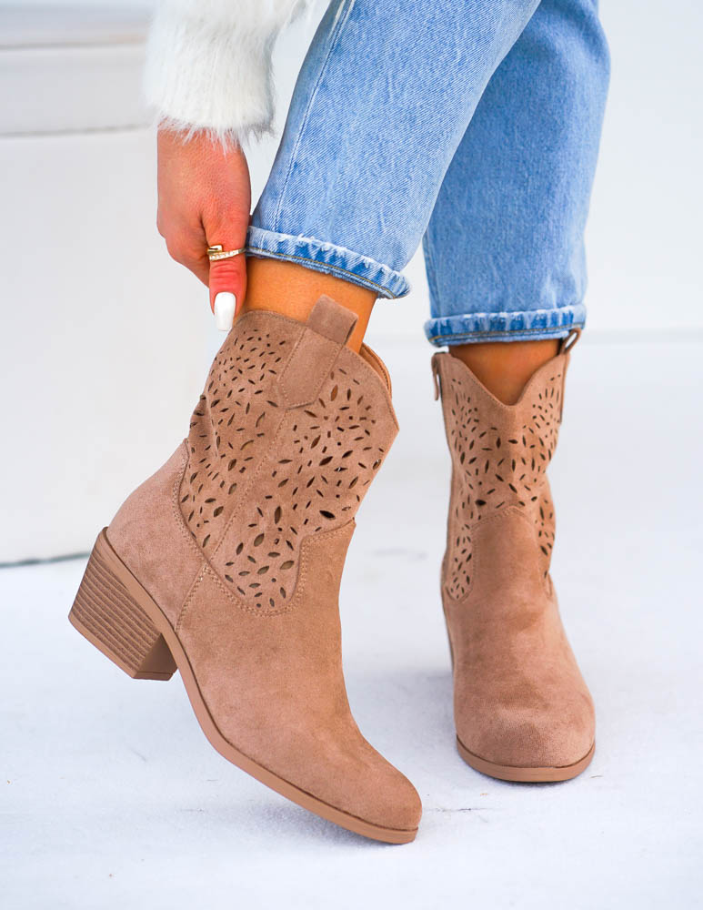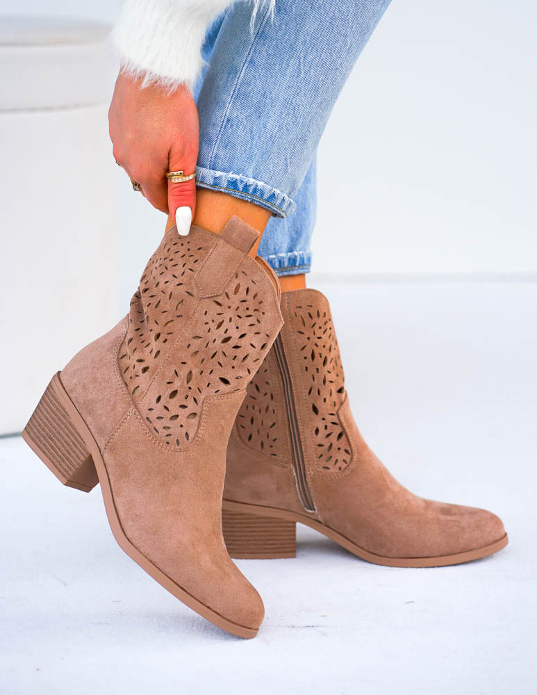 Beżowe Zamszowe Ażurowe Botki Na Słupku Paula