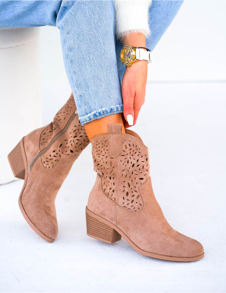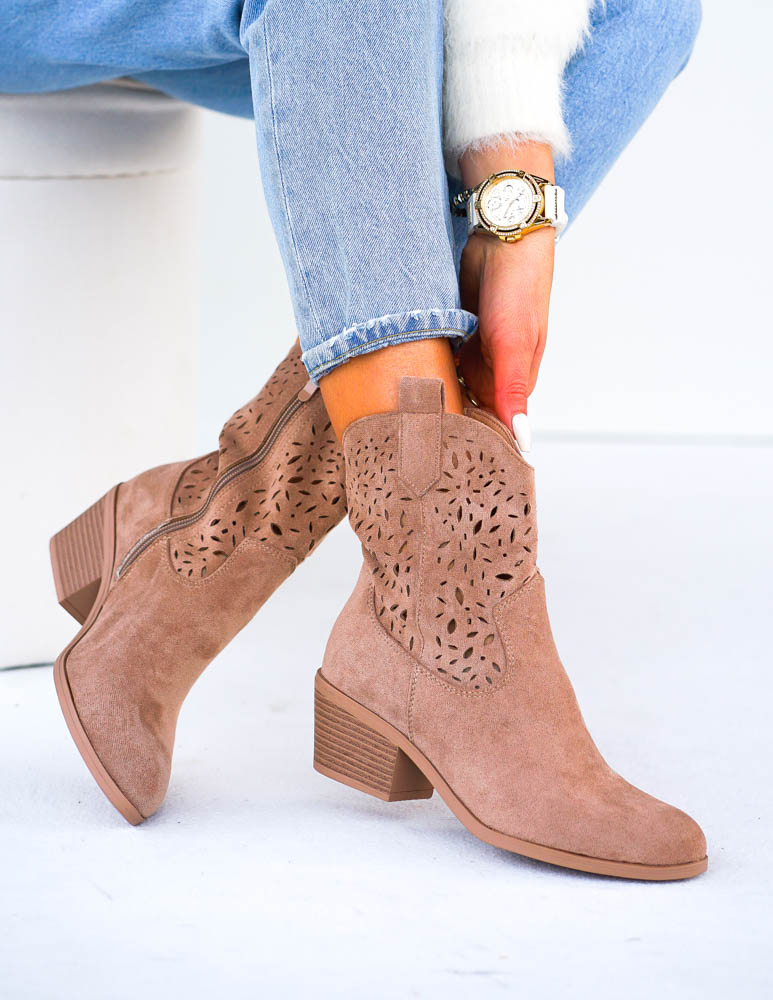 - Kod produktu: Brązowe Ażurowe Zamszowe Botki Kowbojki Mellisa