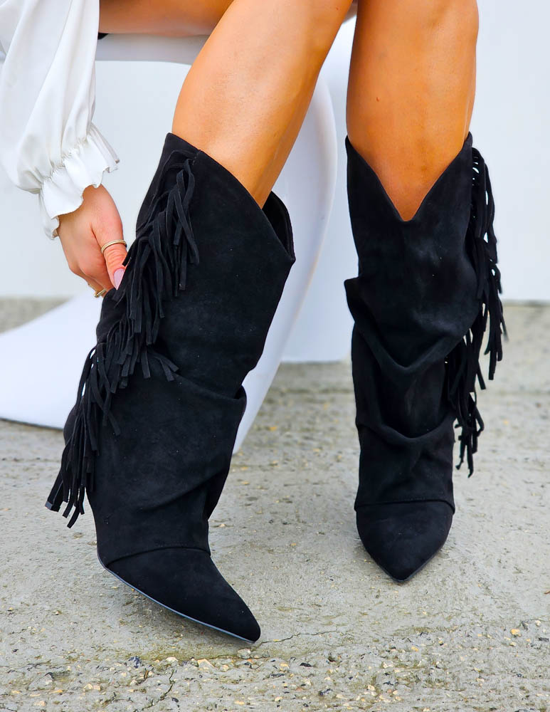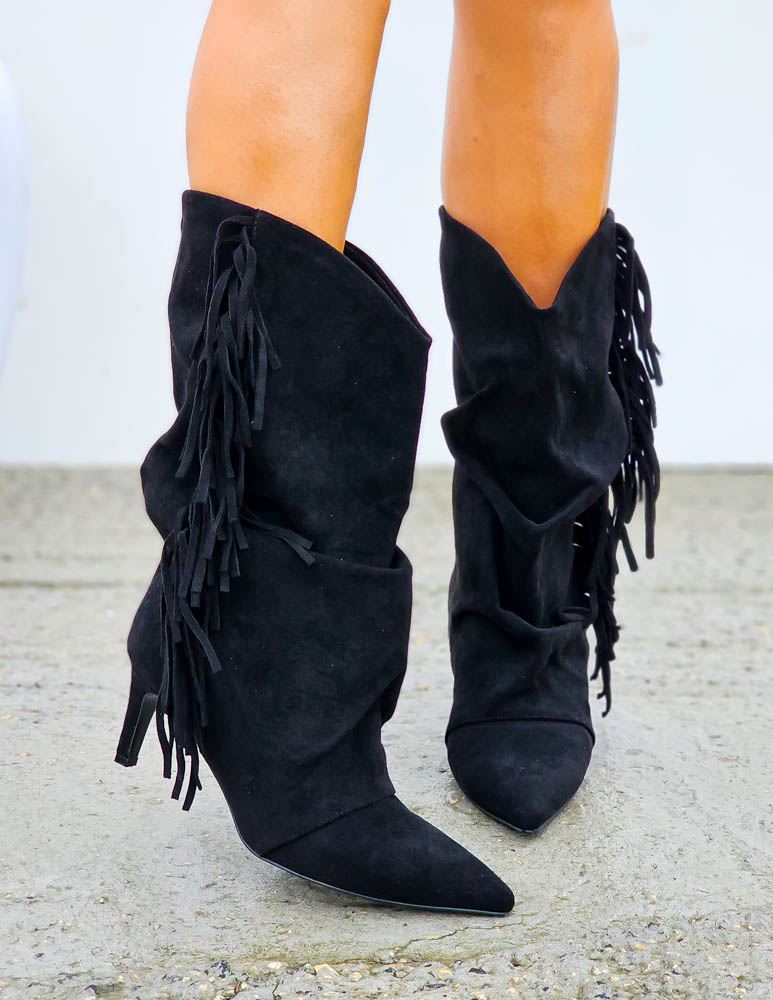• Kod produktu: Czarne Zmszowe Botki Kozaki z Marszczoną Cholewką i Frędzlami