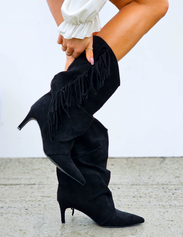 Czarne Zmszowe Botki Kozaki z Marszczoną Cholewką i Frędzlami