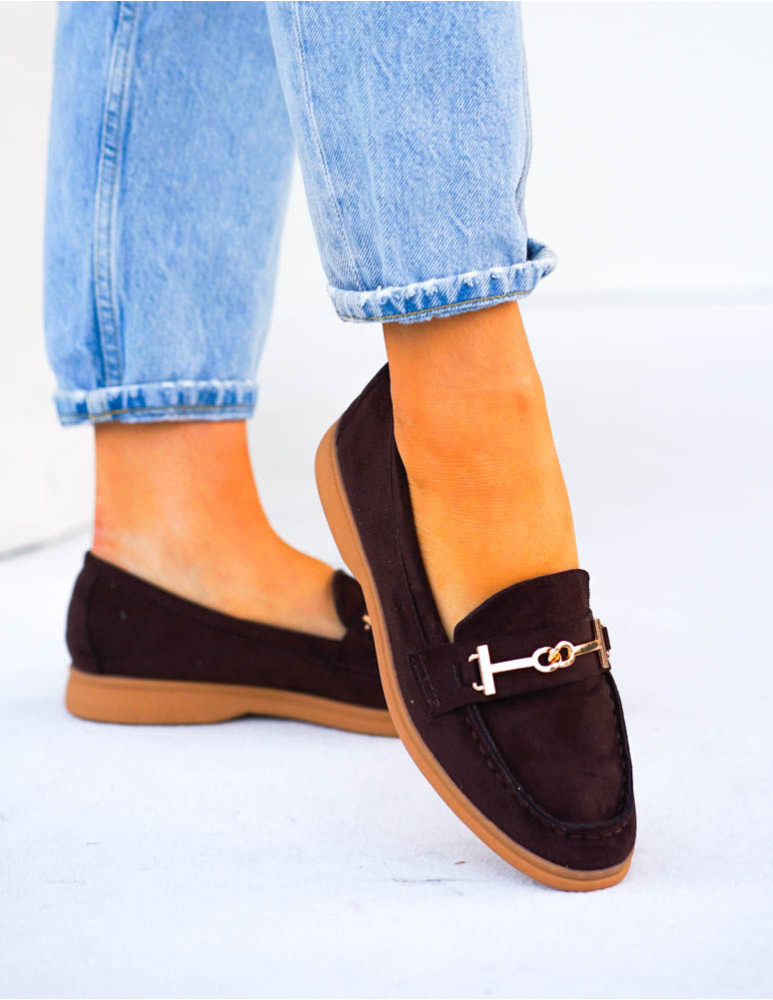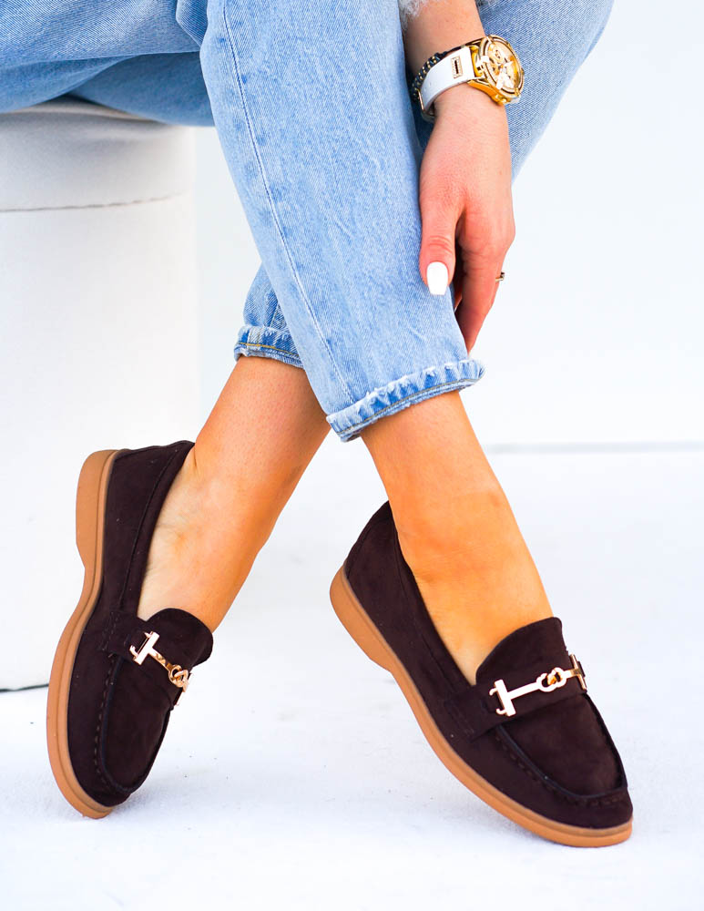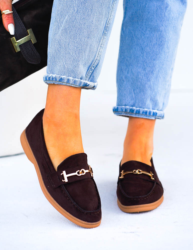 Czekoladowe Baleriny Mokasyny Ze Złotą Klamerką Calzades